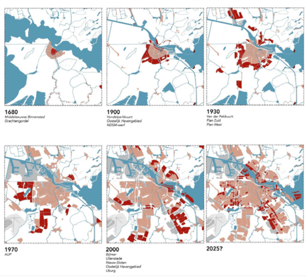 Frequently, references are made to the ghost image of ‘urban sprawl’ in the US but The Netherlands is also familiar with extensive growth of the urban area. The maps above show the growth of the Amsterdam area. Between 1900 and 2000, the population of Amsterdam grew from 317,000 to 727,000 inhabitants. Its surface from 560 to 11,500 hectares.