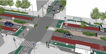 The image above shows a street that meets these requirements. Here is an explanation of the numbers: (1) accessible sidewalks, (2) opportunity to rest, (3) protected cycle routes, (4) single lane roads, (5) lanes between road halves, (6) wide sidewalks, (7) public transport facilities, (8) protected pedestrian crossings, (9) loading and unloading bays, (10) adaptive traffic lights.