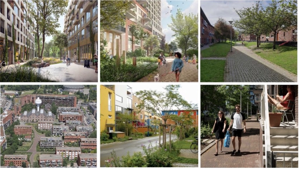 The number of neighborhoods where cars can only park on the outskirts is growing. A classic example is ‘ecological paradise’ Vauban were 50 ‘Baugruppen’ (housing cooperatives) have provided affordable housing (photo bottom middle ). Car-free too is the former site of the Gemeentelijk waterleidingbedrijf municipal water supply company in Amsterdam – (photo bottom left). Here almost all homes have a garden, roof terrace or spacious balcony. The Merwede district in Utrecht (top middle) will have 12,000 inhabitants and for only 30% room for parking is available, and even then only on the edge of the district. Shared cars, on the other hand, will be widely available. The space between the houses is intended for pedestrians, cyclists and children playing.