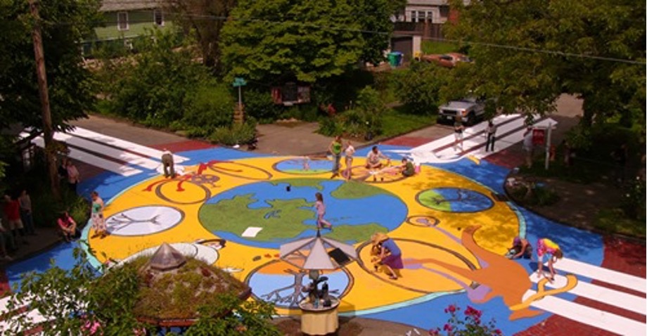 25 years ago, residents of two streets in Portland (USA) decided to turn the intersection of those streets into a meeting place. At first, only tents, tables, chairs and play equipment were placed on the sidewalks, later the intersection itself was used at set times. After some negotiations, the city council agreed, if this would be sufficiently made visible. The residents didn’t think twice and engaged in painting the street as visible as possible (See the image above). The residents agree that this whole project has made their lives happier and that the many activities they organize on the square still contribute to this.